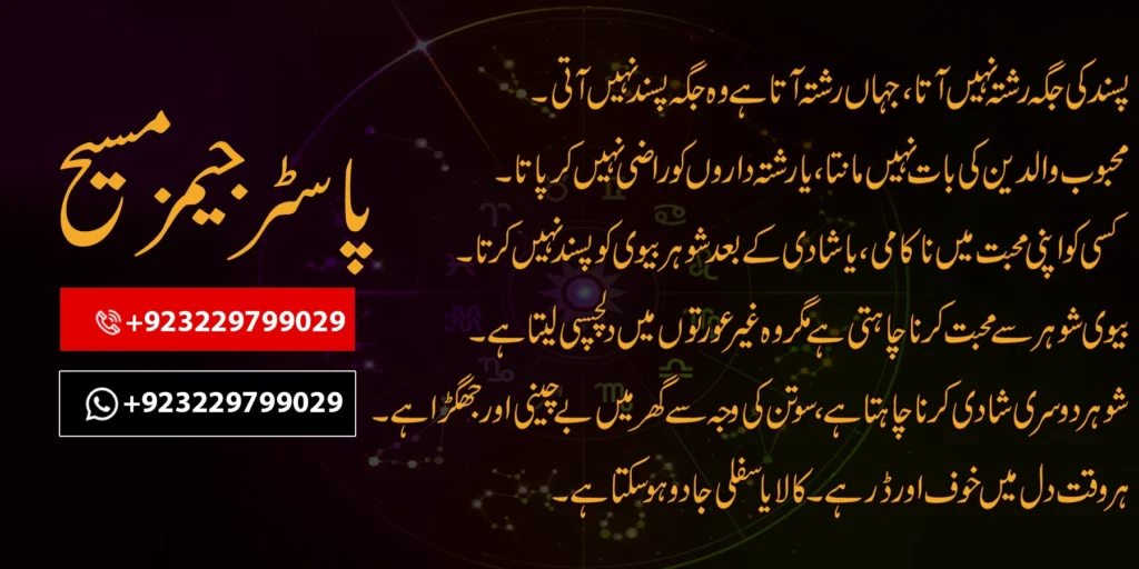 Our Services ✅ Love Problem SolutionPowerful guidance to solve love issues and emotional distress. ✅ Get Your Ex Love BackSpiritual help to reunite with your lost love and restore your relationship. ✅ Manpasand Shadi (Love Marriage)Make your love marriage possible, even against family or social pressure. ✅ Divorce Problem SolutionPrevent separation and bring peace back to your married life. ✅ Husband-Wife Relationship IssuesResolve misunderstandings, fights, and restore harmony in your home. ✅ One-Sided Love SolutionWin the heart of the one you love with spiritual support. ✅ Rohani Ilaj (Spiritual Healing)Cure for depression, anxiety, and other emotional or spiritual problems. ✅ Kala Jadu ka Tor (Black Magic Removal)Protection and removal of negative energies and black magic effects.
